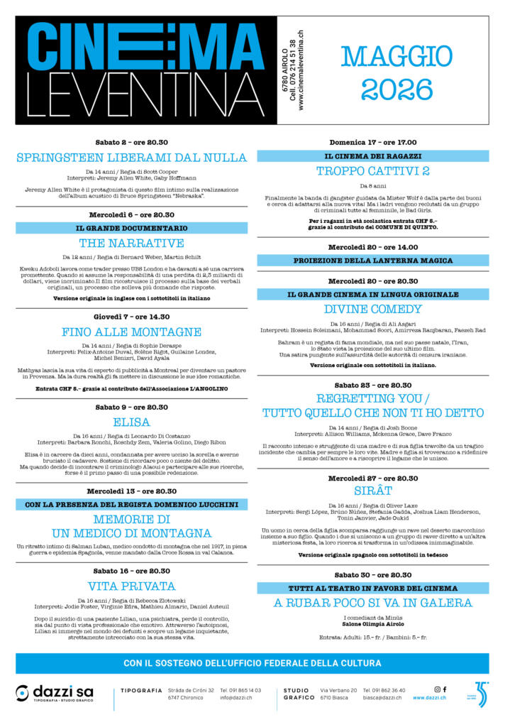 Il programma dettagliato sarà leggibile sulle consuete locandine mensili e sul sito www.cinemaleventina.ch