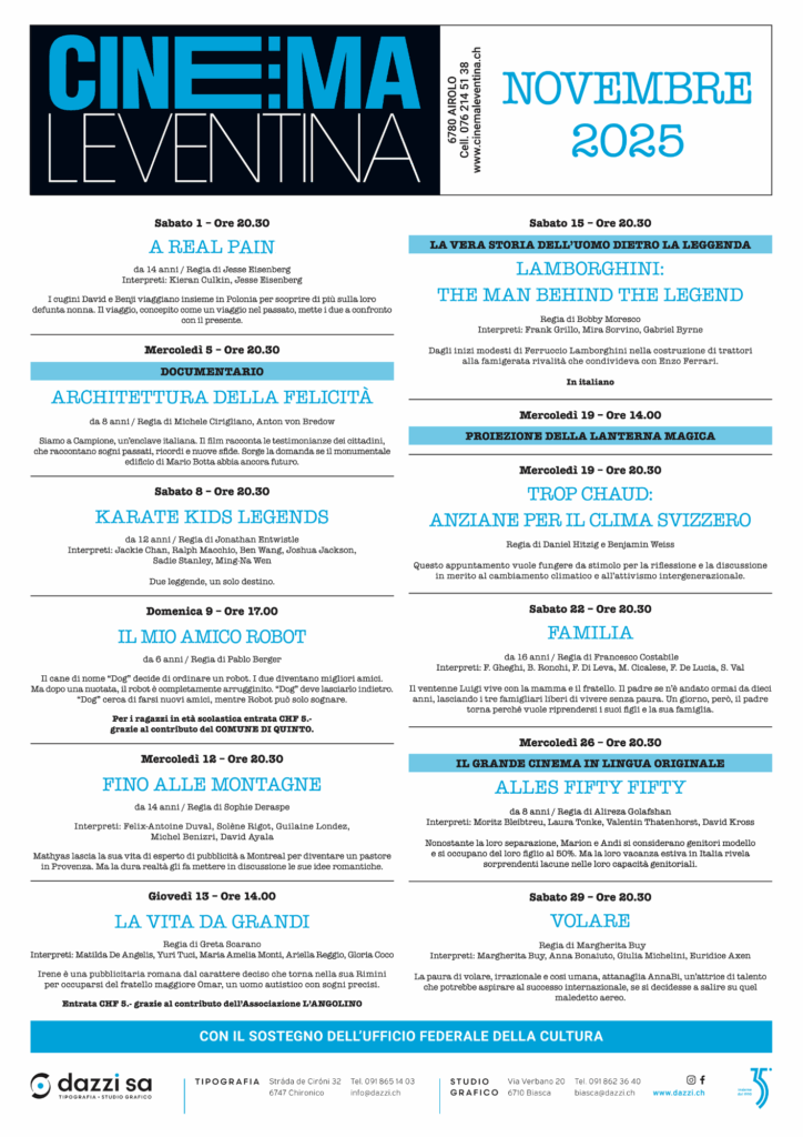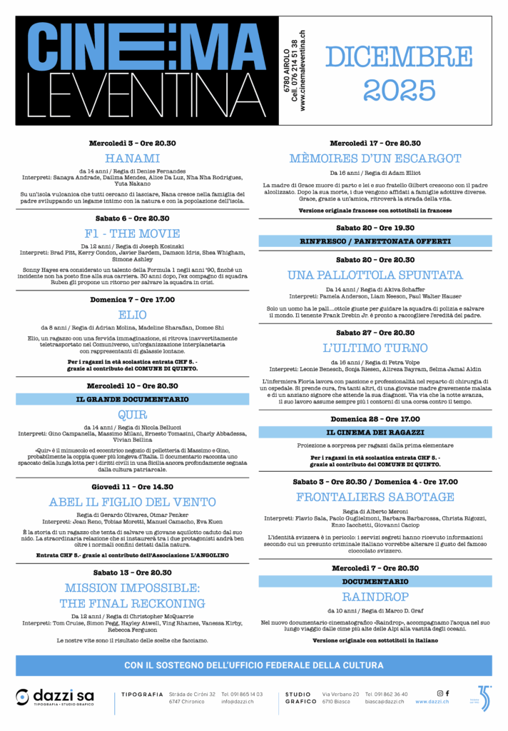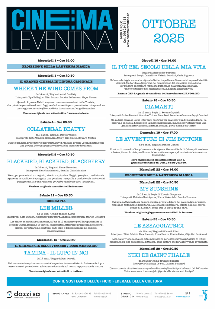 Il programma dettagliato sarà leggibile sulle consuete locandine mensili e sul sito www.cinemaleventina.ch